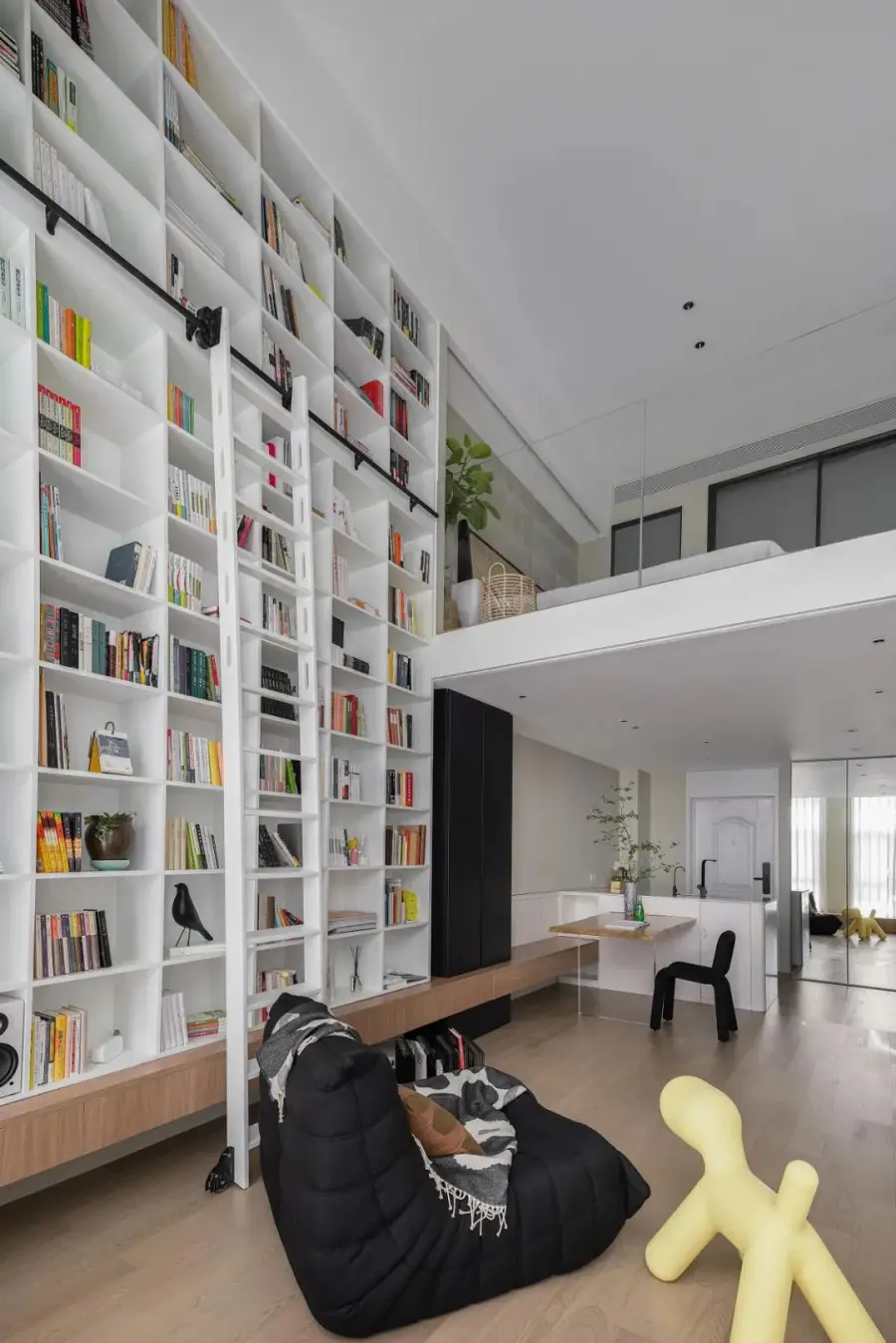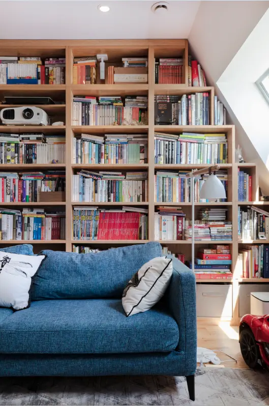 主人一家都爱读书,设计师在客厅的沙发后面定制了整墙开放式书柜,书柜深度30 cm,书柜材质为环保欧松板。主人说“毕竟坐在沙发上读书才是人生第一要务”。